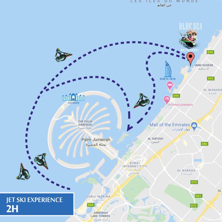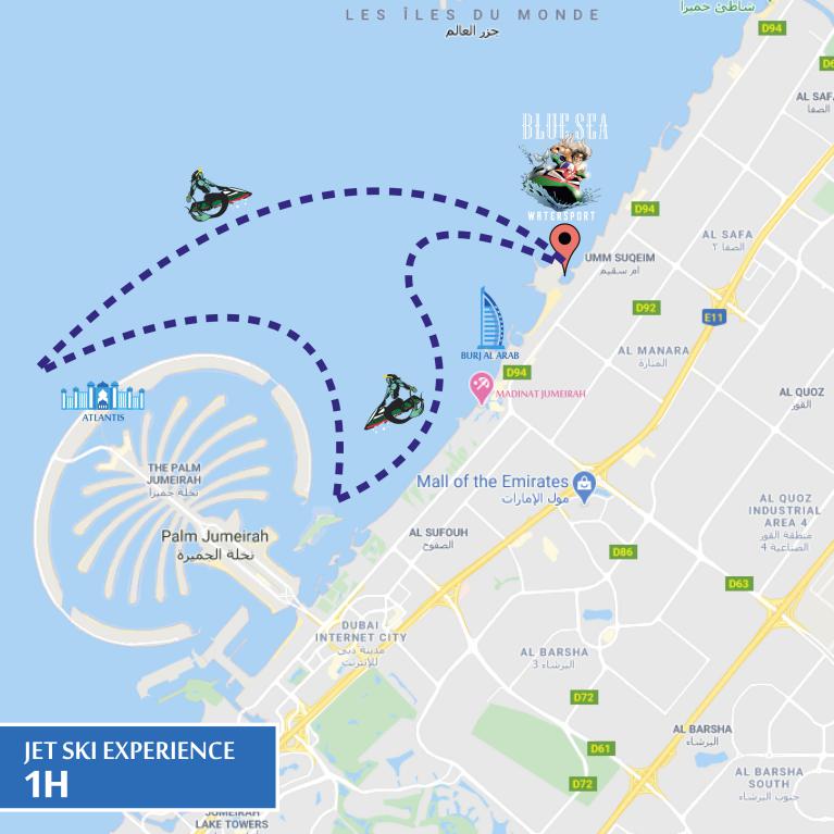 Lancez-vous aux commandes de votre jetski avec Bluesea pour une initiation unique à Dubaï ! Notre instructeur fera une pause photo/vidéo au pied du Burj Al Arab + l'Atlantis + La roue + Burj Khalifa pour vous procurer des souvenirs inoubliables. Ne perdez pas un instant et réserver votre parcours de 2 heures !