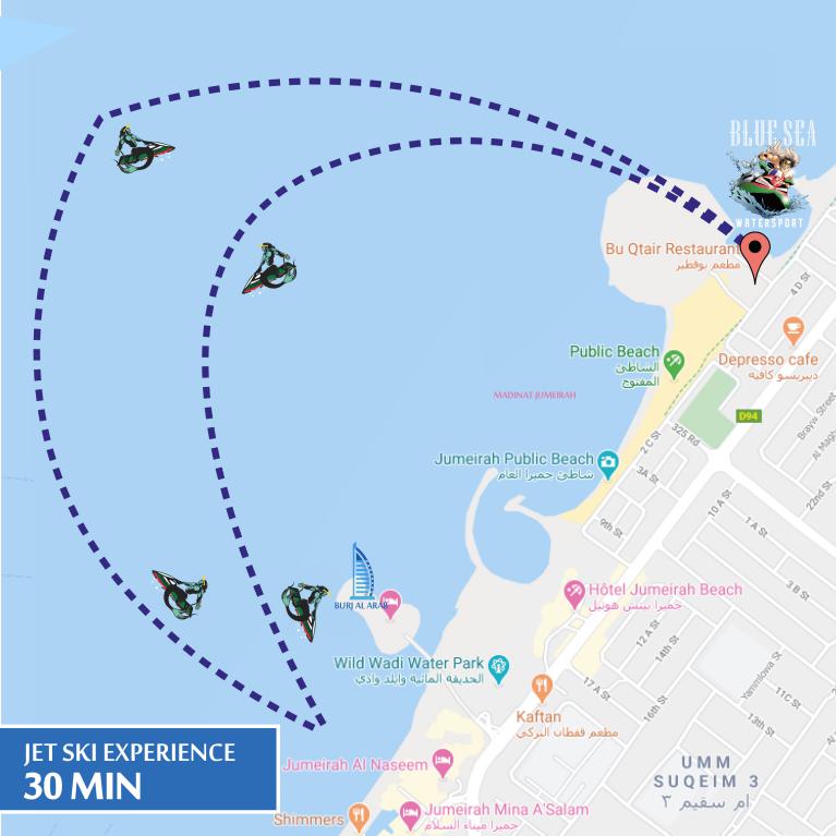 Lancez-vous aux commandes de votre jetski avec Bluesea pour une initiation unique à Dubaï ! Notre instructeur fera une pause photo/vidéo au pied du Burj Al Arab pour vous procurer des souvenirs inoubliables. Ne perdez pas un instant et réserver votre parcours de 30 min chez Bluesea Watersport !